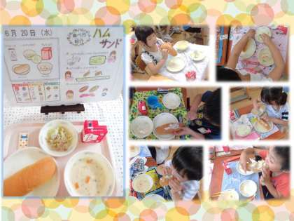 6月20日の献立はコッペパン,牛乳,ハムサンド(具),チャウダーでした。今年度初めてのパンに具をサンドする献立です。1年生の教室では,担任の先生と一緒にパンを開き,マヨネーズとあえた具をはさんでいました。パンにはさむ作業が新鮮だからかいつも以上においしそうに食べてくれていました。