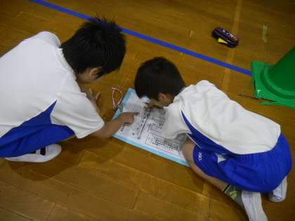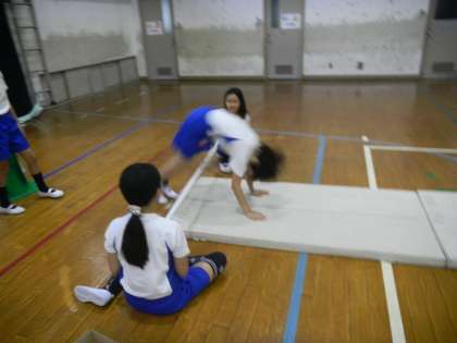 体育の学習でマット運動に取り組んでいます。ねらい1「今できる技で連続技や組み合わせ技に挑戦する。」,ねらい2「少しがんばれば出来そうな技に挑戦する。」という二つの目標に向かってがんばっています。
