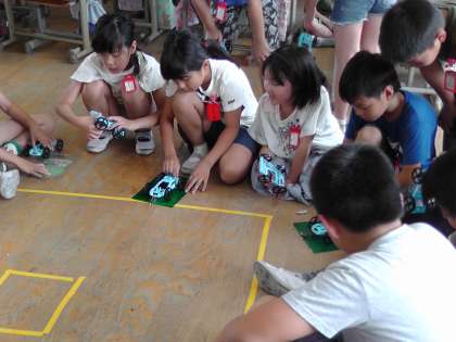 ゴムの力を使ってものを動かす実験をしました。子ども達は,ゴムを長く伸ばすと自動車の実験セットが遠くまで走り,短く伸ばすと少ししか走らないことに気づいていました。とっても楽しそうです。