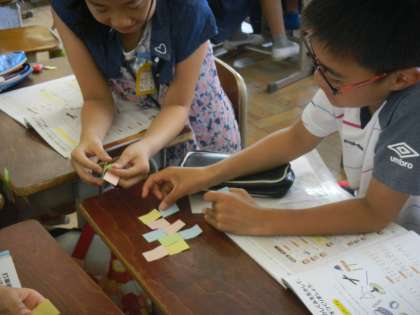 音楽の学習では,打楽器を使ってリズムアンサンブルを作ります。4人グループで,ひとりひとりが違う楽器で違うリズムを担当します。それらを重ねたり,演奏する順番を工夫したりして,ひとつの曲を作ります。付箋を使って,重ね方を考えます。