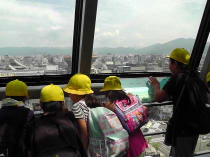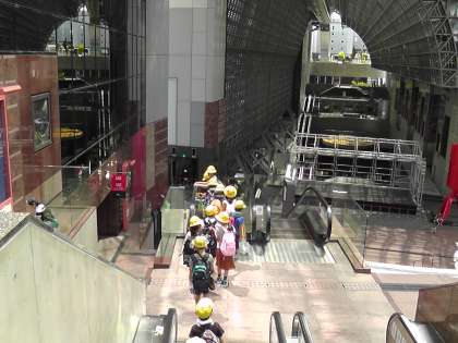 その後は,空中経路を通り,京都駅ビルの屋上から京都市内を見渡しました。北,西,東の三方が山で囲まれていることや,京都市内が碁盤の目になっていること,大文字山が北の方にあること,また,下を見ると電車の線路があることなど,本当に多くのことに気づいていました。