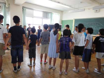 自己紹介をした後,全員で「なべなべそこぬけ」をしました。