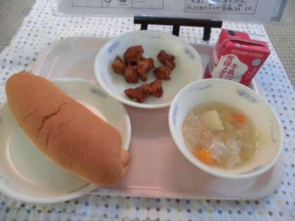 今日の給食は,「味つけコッペパン・牛乳・チキンのアングレス・野菜のスープ煮」でした。