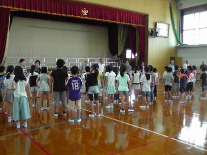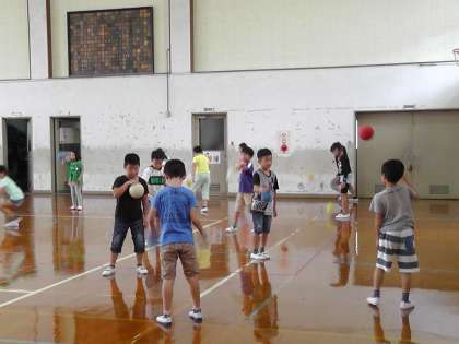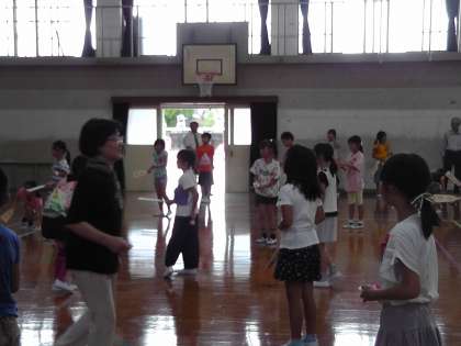退職された中学校や小学校の元先生方にお越しいただき,わらべうたを教えてもらいました。わらべうたに合わせて羽子板で羽根をついたり,ボールをついたり,とっても楽しい時間になりました。いくつかのわらべうたを覚えた様子の子どもたちでした。