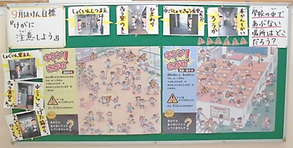 9月は「防災の日」,「救急の日」があり,けがや安全に気をつけたい月ということで,保健室前には,学校でけがをしやすい危ない場所や,イラストから危ない場面を見つける掲示をしています。