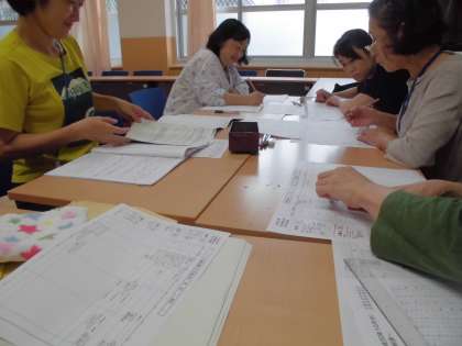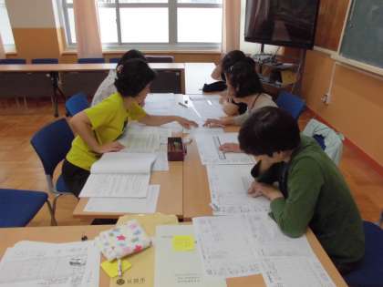 調理作業を衛生的にまた効率的に行うために,給食調理員さんと栄養教諭とで「新作業工程表」づくりに取り組んでいます。