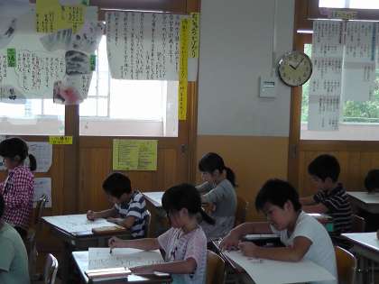 図工でお話の絵に取り組んでいます。お話を読んで思い描いたお気に入りの場面を想像し,下描きしています。