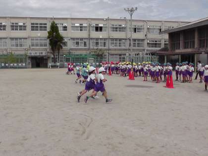 団体競技「ぐるぐるジャンピング」の練習をしました。どのようにすれば,より速く進めることができるのか,同じ色の仲間と話し合い,声をかけ合いながら進めていました。「しゃがもう!!」「がんばれ!!」など子どもたちの一生懸命な声が飛び交っています。