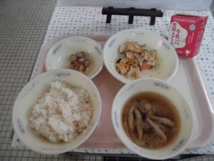 今日の給食は,「玄米ごはん・牛乳・こぎつねちらし(具)・とら豆の甘煮・いものこ汁」でした。