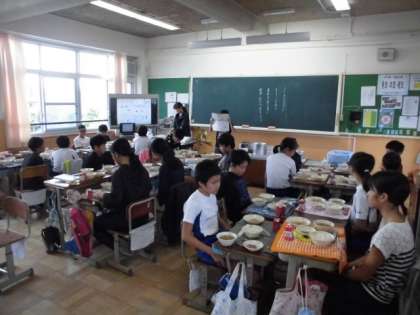 運動会の練習で,体をいっぱい動かしている子どもたち,おかずや汁物といっしょにしっかりと食べていました。