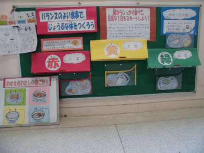 6年生は,「朝食をしっかり食べよう」という内容で食の学習を行っています。職員室前の掲示板でも子どもたちが,メニューカードを組み合わせながら朝ごはんを考えてくれています。