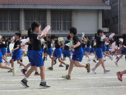 4年生は自分たちで染めて作った扇子をフリフリ。