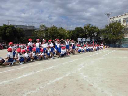 1年生と5年生が協力して取り組むつなひき。力をあわせてがんばりました。1年生と5年生がこれを機会にとても仲良くなりました。