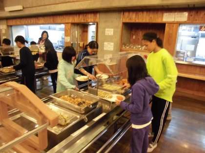 入浴を終え,夕食は食堂でいただきました。登山が予定より早く終わったこともあり,入浴後はロッジでゆっくり過ごすことができました。今日のメニューは,白魚のフライ,クリームコロッケ,肉じゃが,サラダ・・・。どれもおいしそうで,何をどれだけ食べようかと悩んでいる人もいたようです。登山で体力を消耗したのか,2度3度とおかわりの列に並ぶ人もいました。