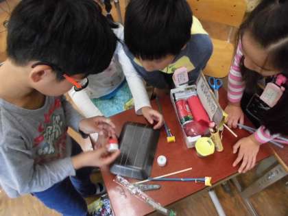 図画工作科「ざいりょうから ひらめき」の授業です。自分の持ってきた材料で遊びながら,どんな絵に表そうか考えています。モールを曲げて,「釣り針に見える!」と声を上げていました。