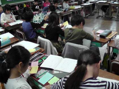 国語科の学習で民話や昔話を読んで,友だちに紹介するための紹介カードを作っています。「三年とうげ」で学習したことを生かして作っています。子どもたちは,ワクワクした気持ちで楽しそうに作っています。