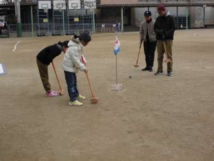 1月12日に親子グランドゴルフ大会が,PTA主催で西京極体育振興会の協力を得て,西京極小学校の運動場で行われました。