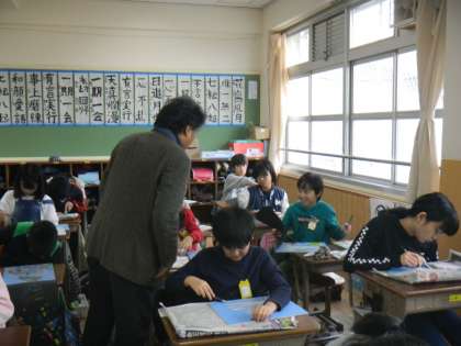 2学期の終わりから取り組んでいる一版多色刷りの版画が仕上がってきています。一版多色刷りは,彩色を繰り返す度に自分の表現したいものの形が画用紙の上に現れてくる楽しさがあります。スクールサポーターの先生からアドバイスもいただいて,世界の名城・名跡が色とりどりに表現されてきています。