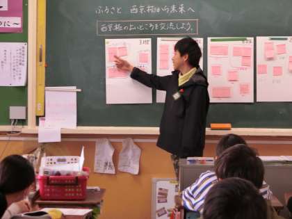 現在総合の学習で,自分たちの住む西京極の町について改めて見直し,将来どのような町になっていってほしいか,そのために自分たちができることは何かということについて考えています。今日は自分の周囲の人にアンケートをした結果をもとに,今の西京極についてみんなで考えていきました。自分たちの住む町の良い所がたくさん見つかりました。