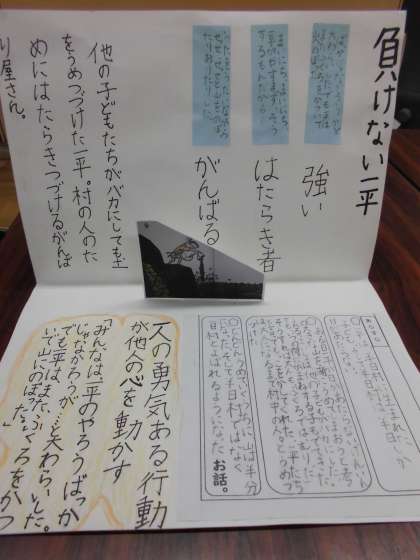 自分の好きなところを選んで,カードの真ん中に貼り,登場人物の人がらを多面的に捉えてまとめました。その他,カードには「あらすじ」「人がら」「心にのこったこと」「どこを読んでそう思ったのか(文の引用)」を書きました。表紙には「印象に残った言葉」を添えて完成しました。
