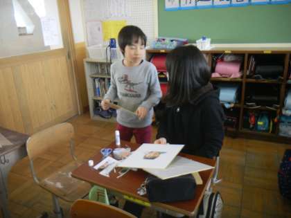毎月行われる「ともだちの日」。その日の中間休みは,たてわりのグループで一緒に遊んでいます。たくさんお世話になった6年生に,そのグループで色紙を作りプレゼントします。その色紙の準備をするのは5年生です。これまでは用意された色紙にメッセージを書くだけでしたが,今年は色紙に写真を貼ったり,6年生の名前を書いたり,全員がメッセージを書いたら最後の仕上げをしたりします。どんな色紙にしたら6年生が喜んでくれるか,一生懸命考えて色紙を作っています。