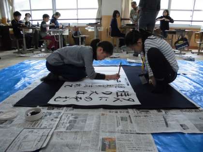 2月16日(土)に行われた書道教室では,西京極小学校の校歌を模造紙サイズの大きな紙に分担して書きました。子どもたちののびのびとした歌詞の文字に感心させられました。