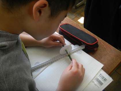 教科書にある「円周測定マシーン」を使って,円の直径と円周の関係について調べました。どんな円でも,円周を直径でわると3.14…になることを発見しました。