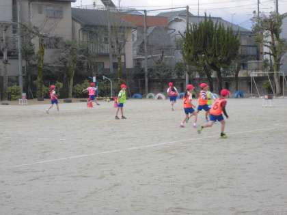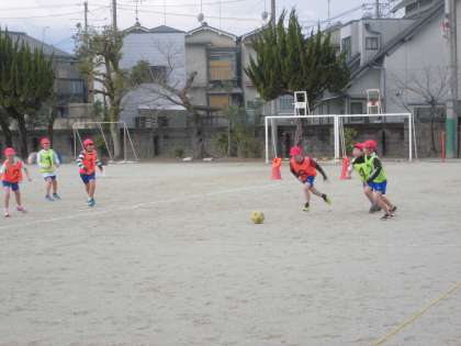 サッカーの要素を大事にしながら,苦手な子どもたちにも楽しめるようにルールを工夫しているので,みんなが主役になって楽しんでいます。