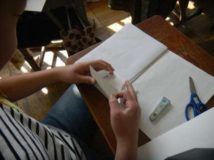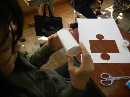 円柱の展開図をかくときは,前の単元「円と正多角形」で学習した円周を求める公式を使って,底面の円の直径から側面の横の長さを求めます。理屈では確かにそうなのですが,直径から計算で求めた円周と,円柱の側面の横の長さは本当に同じなのかを確かめるために,実際に画用紙に円柱の展開図をかいて組み立ててみることにしました。鉛筆の線なのでどうしても少し太くなってしまい,はさみで切るときに実際の長さと多少ずれてしまうことはあったのですが,自分でかいた展開図がきれいな円柱に組み立つと,「やっぱりそうだったんだ!」と,納得している様子でした。