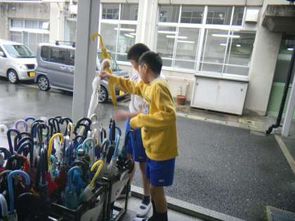 身体計測の帰りには,傘たてにきちんと傘が入っているかをひとりひとり確認しました。子どもたちが登校したすぐ後は傘の先が傘たてから出ていたり,きちんとマジックテープでとめられていなかったりしましたが,確認したあとは全員の傘がまっすぐに入れられており,とても気持ちがよかったです。
