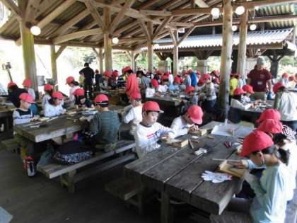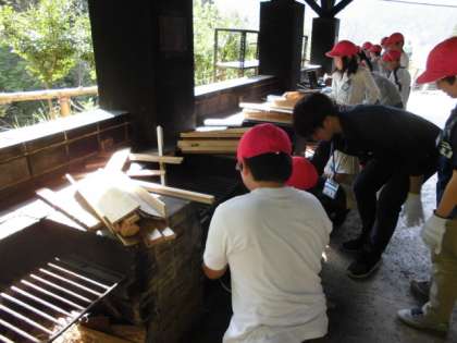 山の家での初めの活動は,竹箸づくりです。棒状の竹を,お箸のように先が細くなるように削っていきます。切出し刀の使い方に慣れず,「全然削れない!」と苦戦している様子でしたが,何とかお箸の形に仕上げることができました。