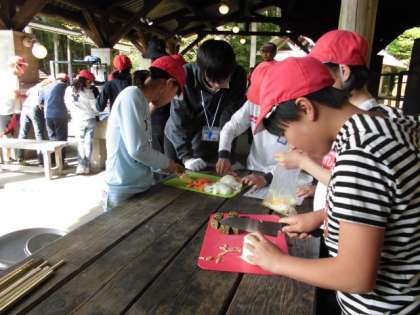 その後,引続き野外炊事を行っています。約3時間かけてカレーライスを作り,食べ,片付けます。今日の目標は,『協力』です。野外炊事では,グループの友達同士で協力して,作業を進めています。