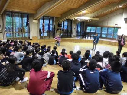 おなかいっぱいになったら,明日のキャンプファイヤーに向けての全体練習です。「明日はよいお天気になりますように」と願いながら,みんなで歌を歌いました。