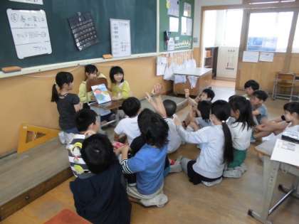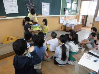 図書ボランティアさんや図書委員さんのまねをして,子どもたちが読み聞かせをしていました。3人でうまく役割分担をし,上手に読み聞かせをしていました。読み聞かせの後は,その本に関するクイズを出していました。本に興味をもつ子が増えています。