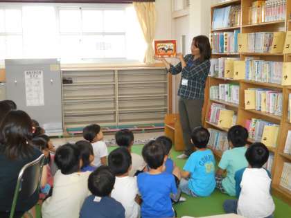 最後には,学校司書の先生に,絵本の読み聞かせをしていただきました。子どもたちは,「はらぺこリンリン♪」と一緒に歌を歌いながら,楽しんで聞いていました。