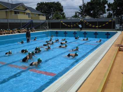 1年生は,プールに入る時の約束や,並び方,バディ等,たくさんのことを学びました。今日は,少ない水位だったので,水の掛け合いっこをしたり,プールの端から端まで大きく歩いたりしながら学習しました。