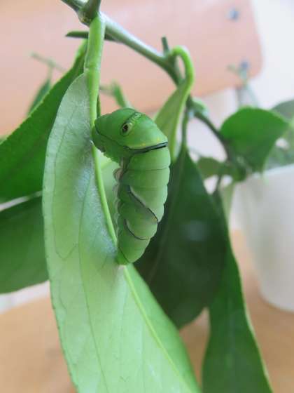 大切に飼っていた青虫がさなぎになりました。昨日までレモンの葉っぱをばりばり食べていたのに,動きがぴたっと止まりました。体から糸を出し,葉っぱとくっつき,さなぎに変身をしました。早くちょうちょになあれ。