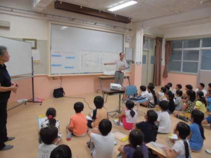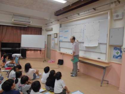 3年生は,総合的な学習で「みりょくいっぱい西京極」という地域学習をしています。学習の中で,子どもたちから「西京極地域に長く住んでいる地域の方から話を聞いてみたい」という声があがったので,今日は地域の方に来ていただき,昔の西京極地域の様子についてお話していただきました。
