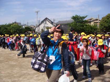 4泊5日分の荷物を背負ってバスに乗り込みます。荷物がとても重く少し体がふらつく感じもあるようですが,元気いっぱい,笑顔いっぱいの子どもたちです。取り組んできたことを充分に発揮してくれることでしょう。