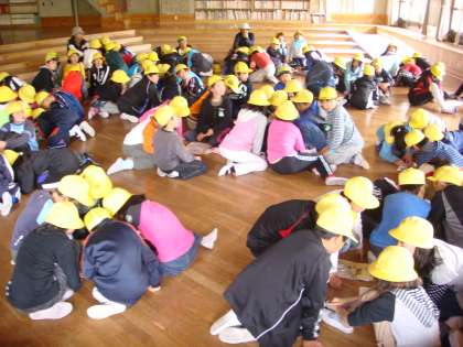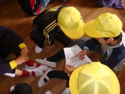 オリエンテーリングを始める前に,ホールで先生からの注意を聞きます。そのお話の聞き方がとてもよいです。しっかりと話し手の先生の方向を向いて聞いています。活動も大事にしますが,子どもたちのこのような姿を育てていくことも長期宿泊のねらいです。子どもたちは,この花背山の家で学んでいます。