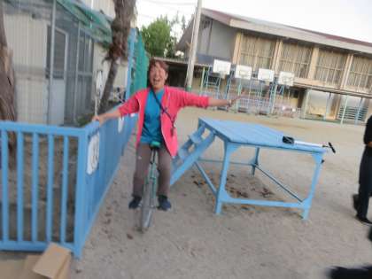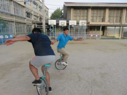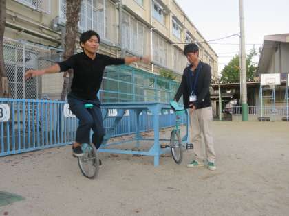 先生も子どもたちと一緒に一輪車を練習し,上達します。