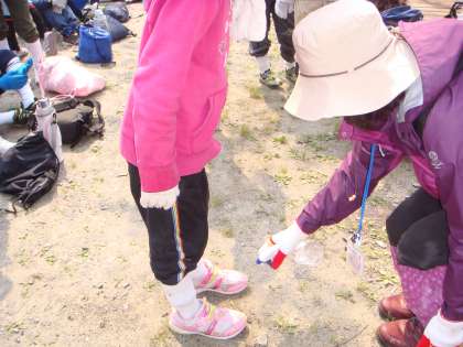 今日の山登りの活動を無事終えて,今,山の家に帰ってきました。朝は,よいお天気だったのですが,予報では,くずれるということ。でも,山の家の先生とも相談させていただいて,実施することにしました。登り始める前は,山の家の先生からお話を聞ききました。そして, 山ヒル対策に食塩水を足元や軍手に吹きかけます。