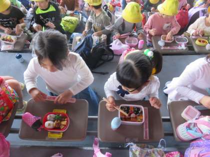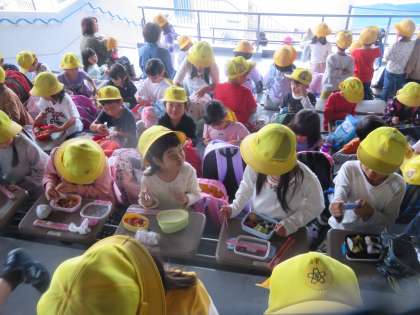 イルカのショーが始まる前にお弁当を食べました。「お母さんの卵焼きおいしいねん。」「ぼくは,ハンバーグ!」とお弁当を見せ合っていました。 また,大きなおにぎりを大きな口でほおばる姿はとてもほほえましかったです。朝早くからお弁当作りをしてくださり,本当にありがとうございました。