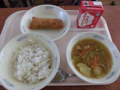 今日の給食は,「麦ごはん・牛乳・カレーあんかけごはん(具)・春巻」でした。