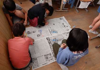 面積の学習では,新聞紙で1平方メートルの正方形を作りました。新聞紙を切って繋げて班で協力する姿が印象的でした。また,1平方メートルの新聞紙を並べて,教室の面積を測りました。今回の学習を通して,1平方メートルの大きさをつかむことができました。