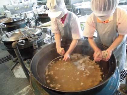 「水菜とつみれのはりはり鍋」は,京野菜の一つである水菜をつかった主菜で,鶏ひき肉やまぐろ水煮,細ねぎ,しょうがを混ぜあわせた手づくりのつみれをいっしょに煮でいます。給食時間,ふんわりと香りのいいつみれを,子ども達は,ごはんと共にいきおいよく食べていました。