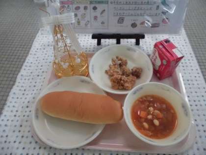 今日の給食は,「ミルクコッペパン・牛乳・スパイシーチキン・ミネストローネ」でした。スパイシーチキンは,鶏肉にヨーグルトやカレー粉,にんにくなどで下味をつけた後,米粉とかたくり粉をまぶして香ばしく油で揚げました。具だくさんのミネストローネと共に,ひと足早いクリスマス料理をいただきました。