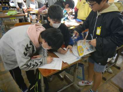 外国語活動では,いろいろなスポーツの言い方を知り,オリンピックでは何の競技が見たいかを聞き合う活動をしています。自分もその競技が見たい場合は,日本語ではなく,英語で”Me too.”と答えている子どもたちもいました。子ども達には,サッカーとラグビー,バレーボールが人気でした。