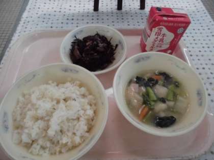 今日の給食は,「麦ごはん・牛乳・すいとん鍋・ひじきの煮つけ」でした。