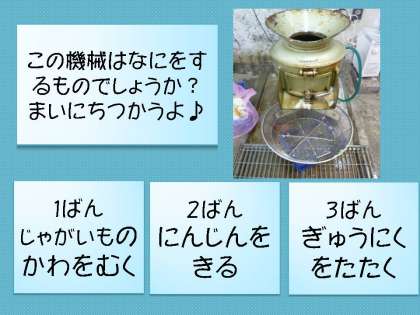 クイズでは大量調理に必須のアイテム「皮むき機」についてです。